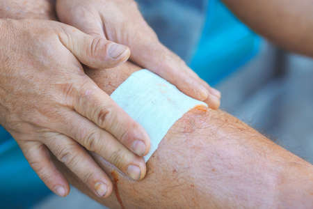 process of applying a bandage on the injured leg closeup, desmurgy