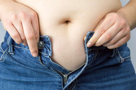 Man in jeans hold his fat belly. Weight gain