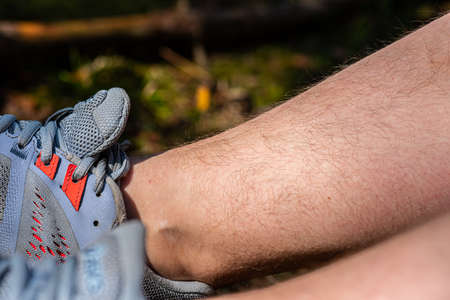 Naturally hairy woman legs. Blue sneakers.