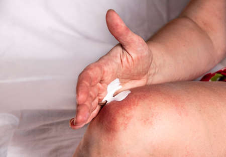 Applying a therapeutic ointment for allergic rashes on the leg. Treatment of allergies, cosmetic and dermatological problems with ointment.