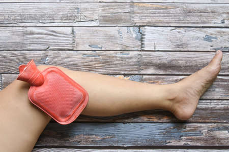 hot red water bottle on woman knee to healing pain on grungy wood, Health care, remedy for pains concept