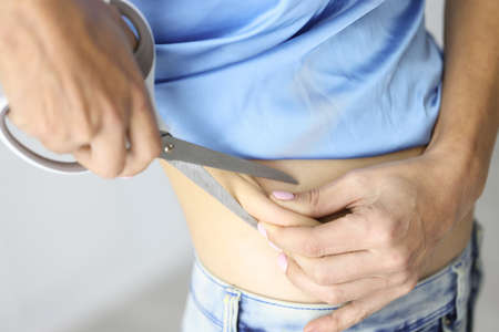 Overweight woman with scissors on her sides closeup