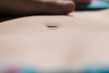 Stomach of young woman in lying and sunbathing in sunny summer day. Personal perspective