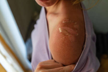 Sunburn of the shoulders. A girl with an excessive tan. Consequences of sunburn on the skin.