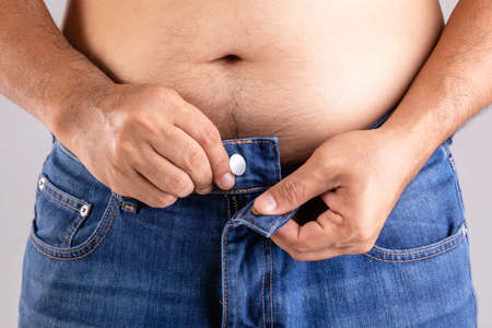 Middle age man with big belly trying to fasten jeans.man trying to fasten his trousers, because of the weight gain.