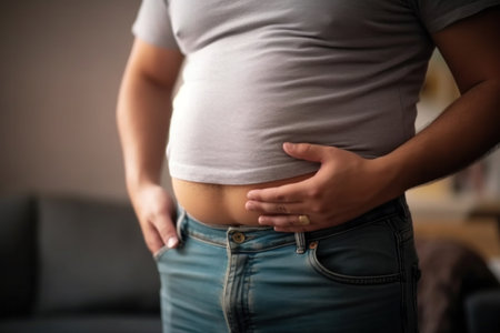 overweight man's hand holds excess belly fat.
