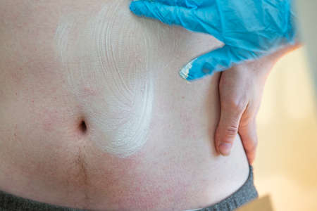 A nurse smears a body covered with an allergic rash to a patient. The hands of a doctor smear a person's skin with a white ointment.