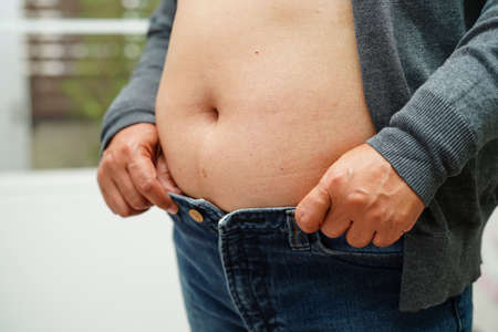 Overweight asian woman use hand to squeeze fat belly big size overweight and obesity.