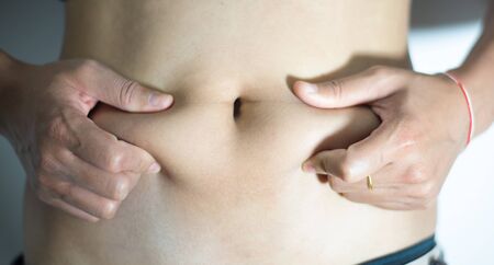 Side view of woman hand catching fat body belly paunch , diabetic risk factor