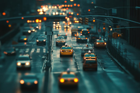 A vibrant city scene capturing the rush hour traffic at night. Cars illuminate the wet streets, creating a dynamic and dynamic urban atmosphere filled with movement and energy.
