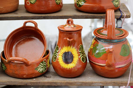 Sale of earthenware for storing and preparing food. Market and kitchen products concept