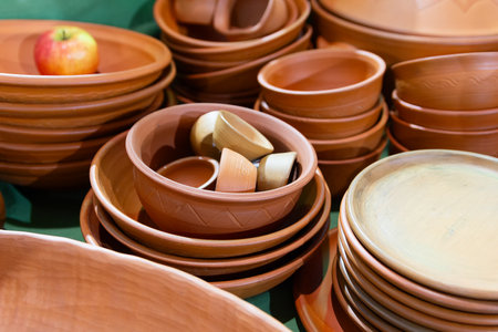Trade of traditional ceramic bowls. Showcase of handmade ceramic pottery. Close-up. Selective focus.
