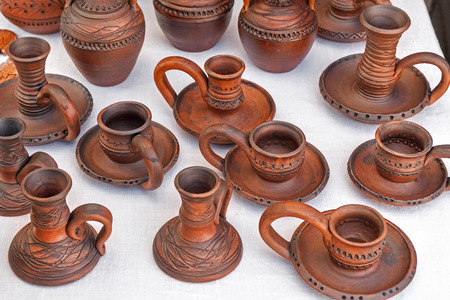 A variety of ceramic candle holders are represented at a County fair. Household items made of clay. Traditional Belarusian crafts.
