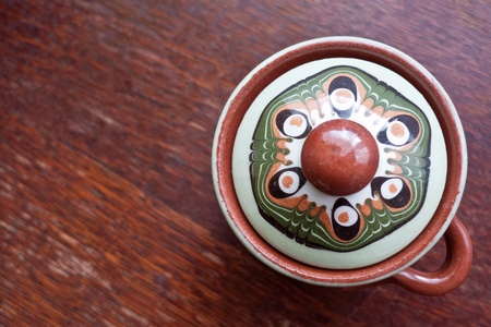 Ethnic pottery, vintage wooden background, selective focus