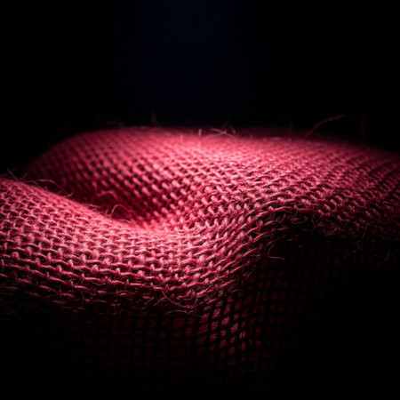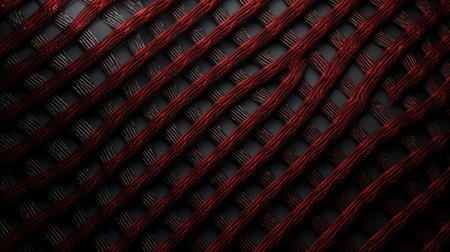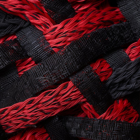 a close-up photo of a red fabric with intertwined networks, featuring a combination of light red and dark black colors. the fabric is made of natural materials, resulting in an accurate and detailed texture. this unique composition and framing make the image stand out. found on flickr. ai generated