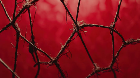 This close-up image features intertwined branches against a striking red background, highlighting the textures of nature and creating an abstract visual experience.