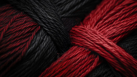 This close-up showcases a tangle of black and red cotton threads, highlighting their texture and vibrant colors, perfect for various crafting projects and textile art.