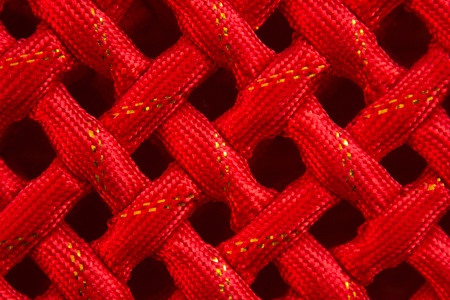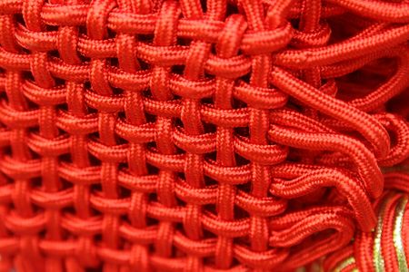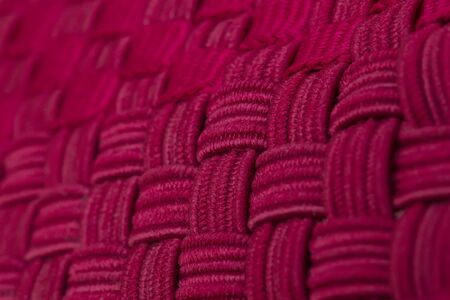 selective focus red rope texture made of fine cotton yarn. soft string strands with crisscross webbing