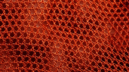 a large-sized mesh fabric in vibrant orange color, resembling the intricate details captured by a macro lens. the dark bronze hue adds a touch of sophistication, while the trompe-l'oeil illusionistic effect creates a mesmerizing visual. enhanced by the sabattier filter, the image showcases the infinity nets pattern with a shiny and glossy finish, highlighting the precise craftsmanship. ai generated