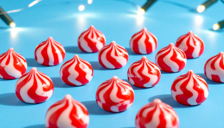 Numerous small red and white swirl candies are neatly arranged on a blue surface with blurred festive lights...