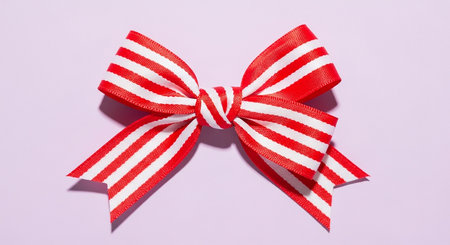 A red and white striped ribbon bow is displayed on a light purple background in a studio shot.