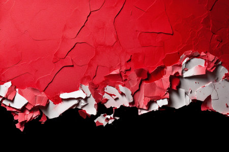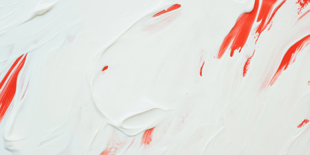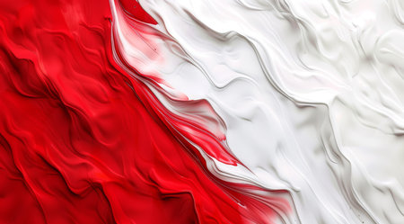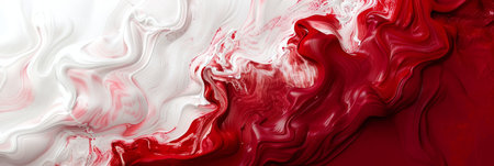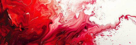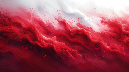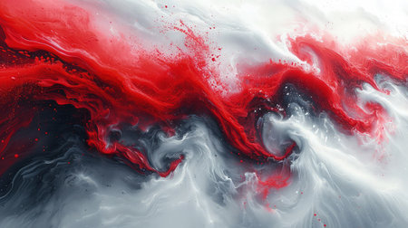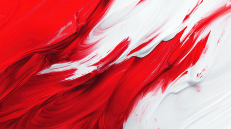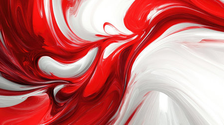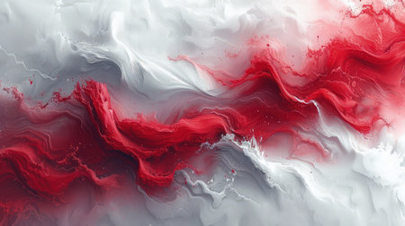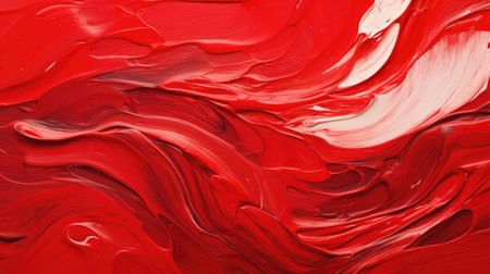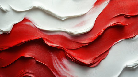 Brightly colored abstract waves of red and white paint create a vibrant texture, showing the beauty of artistic expression and fluidity in design