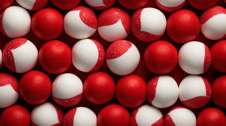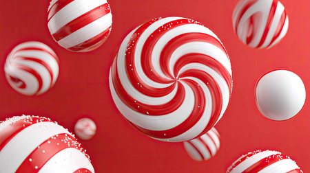 Colorful swirling candy balls in red and white colors float against a bright red background, creating a festive and playful atmosphere perfect for holiday decorations.