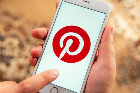 Palo Alto / USA - August 08 2019: Female hand with Apple phone with logo of social media Pinterest on the screen. Social media icon. Can be used as illustration for news media or marketing concept