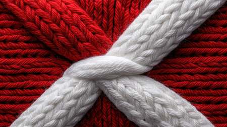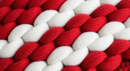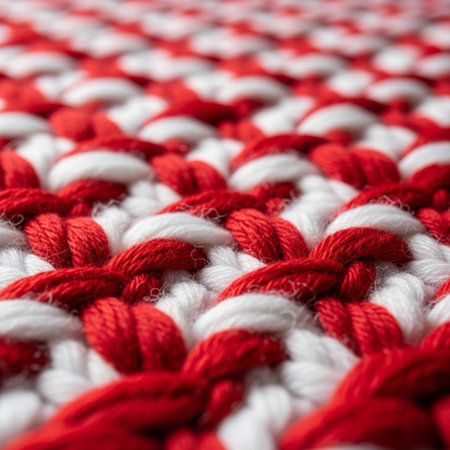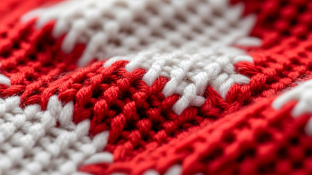 Intricate macro view of a textured, hand-knitted textile featuring bold red and crisp white yarn woven in a repeating pattern. The soft, tactile surface evokes warmth and comfort, perfect for cozy winter themes or crafting inspiration.
