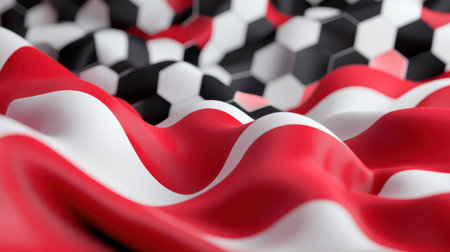 A dynamic composition featuring flowing red and white fabric in the foreground, creating a sense of movement and texture, with a blurred background of black and white soccer balls.