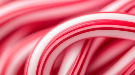 An extreme close-up captures the smooth, glossy curves of red and white striped candy canes, evoking a sense of winter holidays, festive cheer, and sweet indulgence. The shallow depth of field blurs the background, focusing attention on the iconic confectionery.