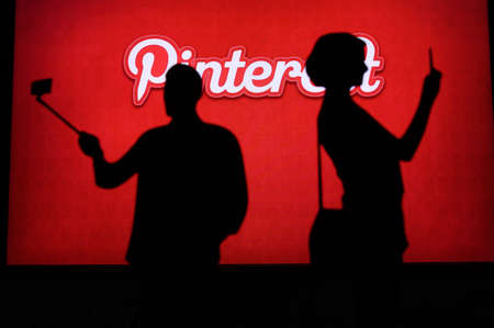 NEW YORK, USA, 25. MAY 2020: Pinterest American image sharing and social media service . Couple taking a photo on a mobile man use a selfie stick. Company logo on screen in background