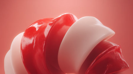 A stunning image of a twist of creamy red and white soft serve ice cream. The vibrant colors and smooth texture make it perfect for summer desserts and sweet treats.