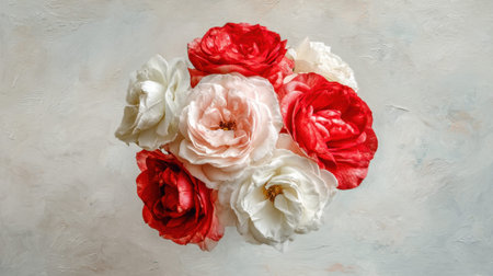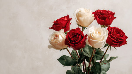 A stunning arrangement of red and white roses set against a soft neutral background, perfect for adding elegance to any romantic occasion or floral display.