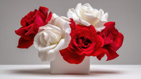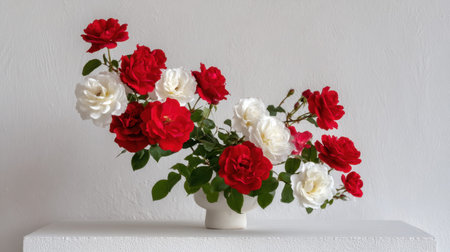 A stunning floral arrangement featuring vibrant red and white roses in a minimalist vase, creating an elegant and inviting atmosphere for home decor or special occasions.