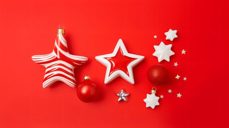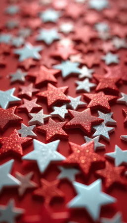 A dazzling array of red and white stars glimmers against a bold red backdrop, creating a festive and cheerful atmosphere. The sparkling texture of the stars adds a touch of magic, perfect for celebrating special occasions and holidays.