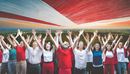 A colorful and dynamic artwork depicting a diverse group of individuals raising their hands together in unison, representing the universal fight for human rights, equality, solidarity, and the