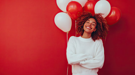 Adorable woman in a soft white sweater, smiling warmly and holding a large bunch of helium balloons on a festive red backdrop.
