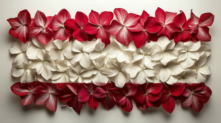 A creative floral composition featuring alternating stripes of vibrant red and white petals, arranged symmetrically on a neutral background.