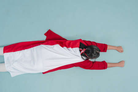 Young Indonesian woman wearing country flag on her back and raising hands superhero flying gesture. Indonesia Independence Day concept.