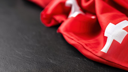 A close-up view of a red fabric featuring white symbols, beautifully contrasted against a dark surface. This striking textile evokes concepts of culture and identity, making it ideal for artistic and design projects.