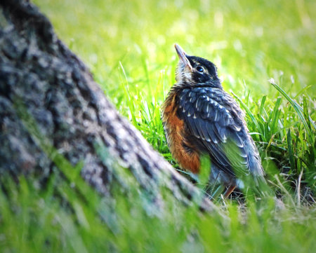 This photo features a baby Robin on the ground gazing up at a tree.