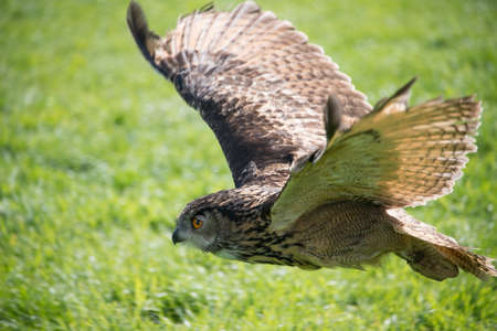 A portrait of a eurasian eagle-owl sitting on a wooden bar covered with fake grass during a bird of prey show given by a falconer. The bird is looking around for the next sign to start flying again.