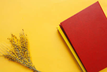A beautiful spring bouquet of fresh Mimosa with two red hardcover books on a clear yellow background. books day mockup
