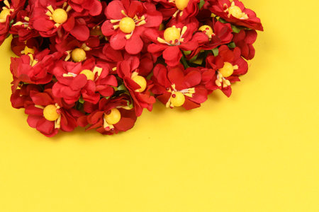 red flowers bunch is on yellow background with blank space - love and holiday concept