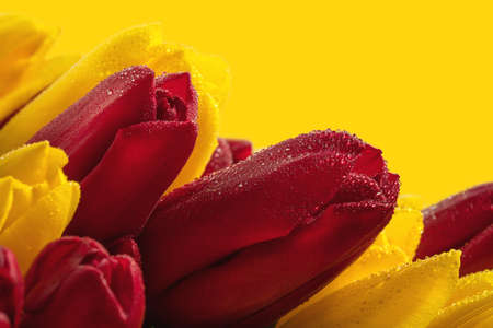 spring flowers, red and yellow tulips with water drops on the petals