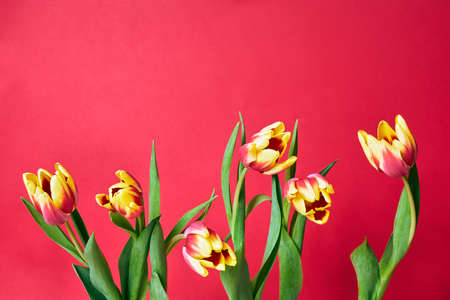 beautiful bouquet of red tulips on a red background