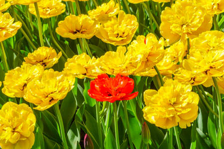 Field of yellow and one red tulips. Flower background. Summer garden landscape