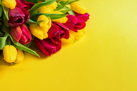 Beautiful flowers tulips on a yellow background, top view with copy space. Spring or summer floral background with copy space.
