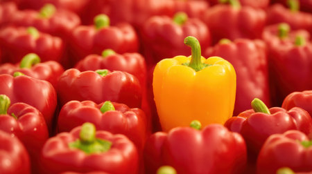 A striking image of a yellow pepper standing out amid an array of red peppers, showcasing the vibrant colors and freshness typical of a market display.